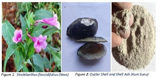 The Kum dye, derived from the leaves and young shoots of Strobilanthus flaccidifolius (Fig. 1), holds significant cultural value within the Meitei community (Devi, 2019; Ningombam et al., 2012). Its preparation involves careful fermentation of the plant material combined with calcined oyster shell ash (CaCO₃) or Kum Sunu (Fig. 2), acting as a natural mordant (Singh et al., 2009). The dye is enhanced using Pasania pachyphylla bark, banana leaf ash, molasses, mustard oil, and kuhi bark solution for better color intensity and durability. The dyeing process demands repeated dipping and air drying, yielding vibrant, long-lasting colors.