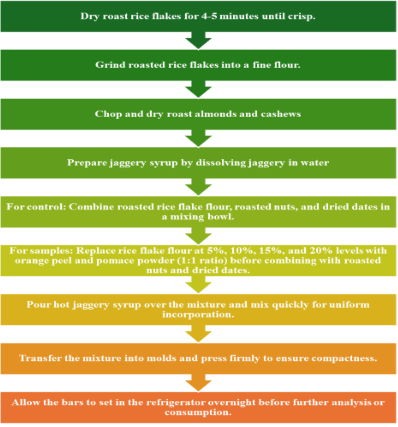 The formulation of value-added snack bars was executed in accordance with the standardized methodology depicted in Figure 1. Rice flakes underwent a dry roasting process in a pan for a duration of 4 to 5 minutes until achieving a crisp texture, thereby ensuring uniform roasting to augment both flavor and texture. Subsequently, the roasted rice flakes were ground into a fine flour and set aside for later use. Almonds and cashews were finely chopped and subjected to dry roasting over low heat for 5 to 6 minutes until they emitted an aromatic scent, thereby enhancing both crunchiness and flavor. Jaggery was dissolved in water at a 2:3 ratio of jaggery to water and heated until the syrup attained the consistency characteristic of the thread stage. The flour derived from roasted rice flakes was meticulously mixed with the roasted nuts and dried dates, after which the hot jaggery syrup was incorporated, and the mixture was folded uniformly to ensure adequate binding. The resultant mixture was transferred into moulds, subjected to firm pressing, and levelled to realize the desired shape an compact structure. The snack bars were allowed to set under refrigerated conditions overnight, subsequent to which  they were demoulded and prepared for consequent analytical evaluation. All experimental samples were developed utilizing the similar procedure, with rice flakes flour being partially substituted at proportions of 5, 10, 15, and 20 percent through the use of a 1:1 blend of orange peel powder and orange pomace powder.