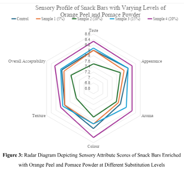 Figure 3: Radar Diagram Depicting Sensory Attribute Scores of Snack Bars Enriched with Orange Peel and Pomace Powder at Different Substitution Levels