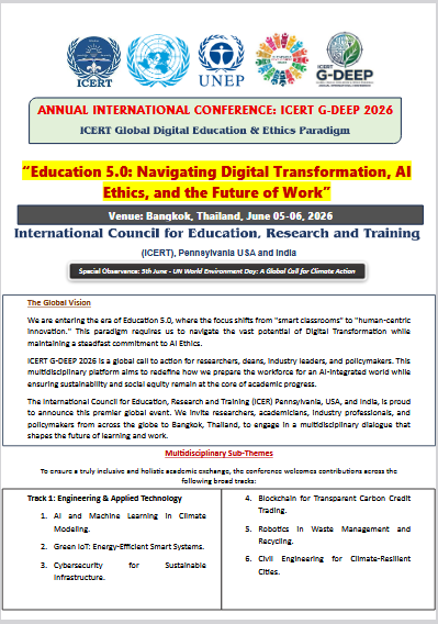 The International Council for Education, Research and Training (ICERT), USA & India, is proud to announce the Annual International Conference: ICERT G-DEEP 2026. Join us in the vibrant city of Bangkok, Thailand, as we bridge the gap between human-centric innovation and digital transformation!
